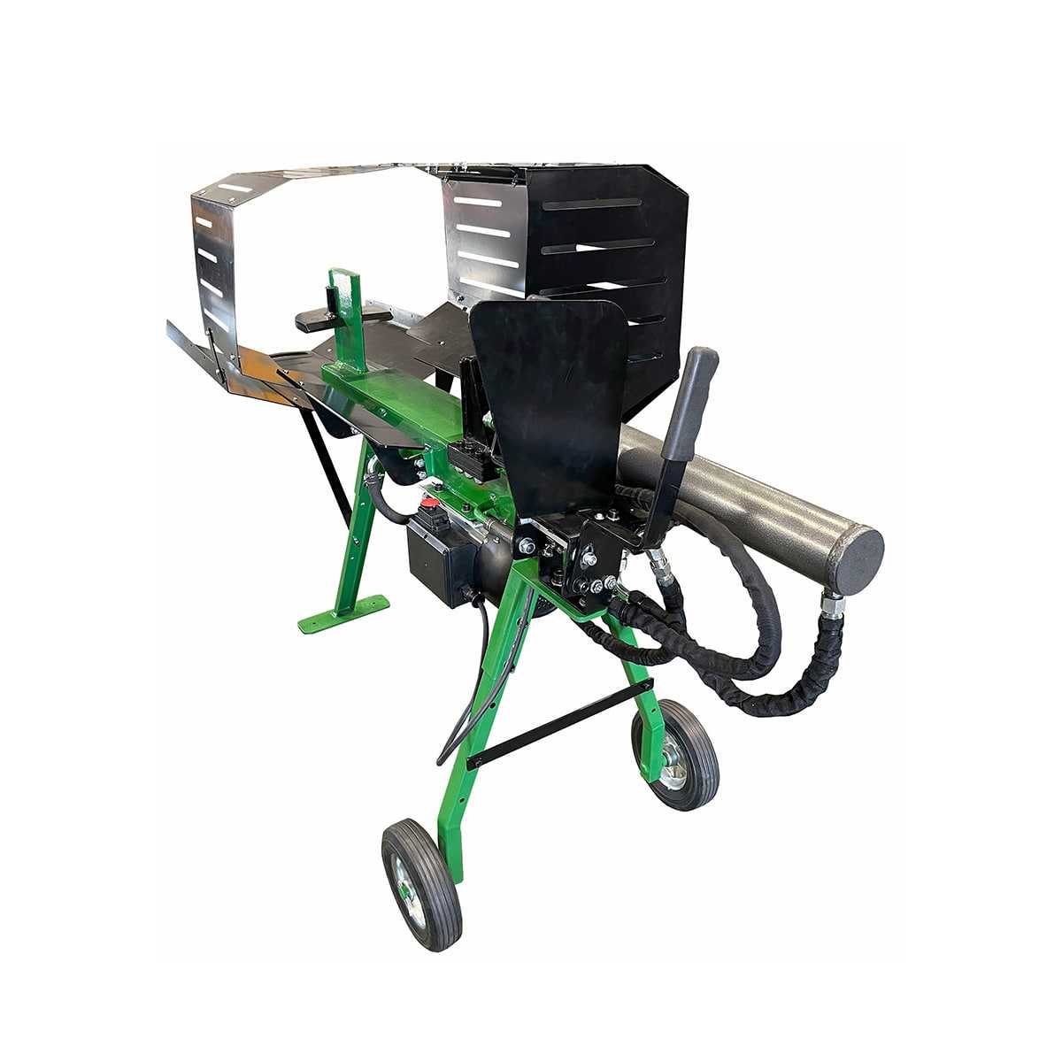 Der Holzspalter ist mit Rädern und einem stabilen Sammeltisch mit Griffmulden ausgestattet, um den Transport zu erleichtern. Der stabile Tisch sorgt für eine schnelle und reibungslose Handhabung des gespaltenen Holzes. Für Ihre Bequemlichkeit wird der Holzspalter mit Öl im integrierten Tank geliefert und einem Anschluss mit Not-Aus für zusätzliche Sicherheit.
